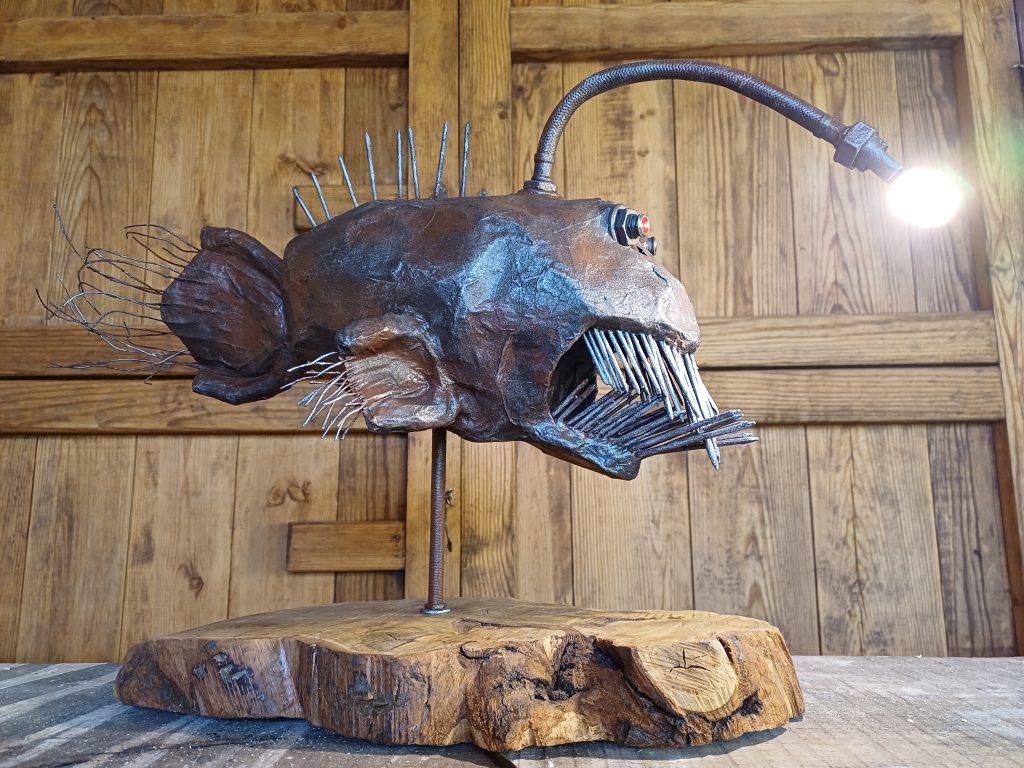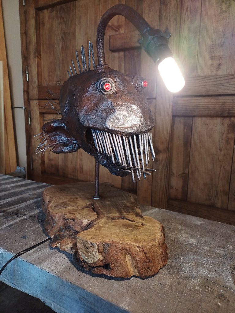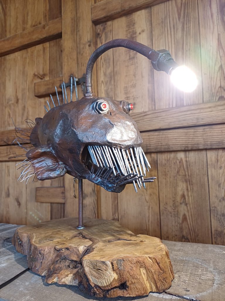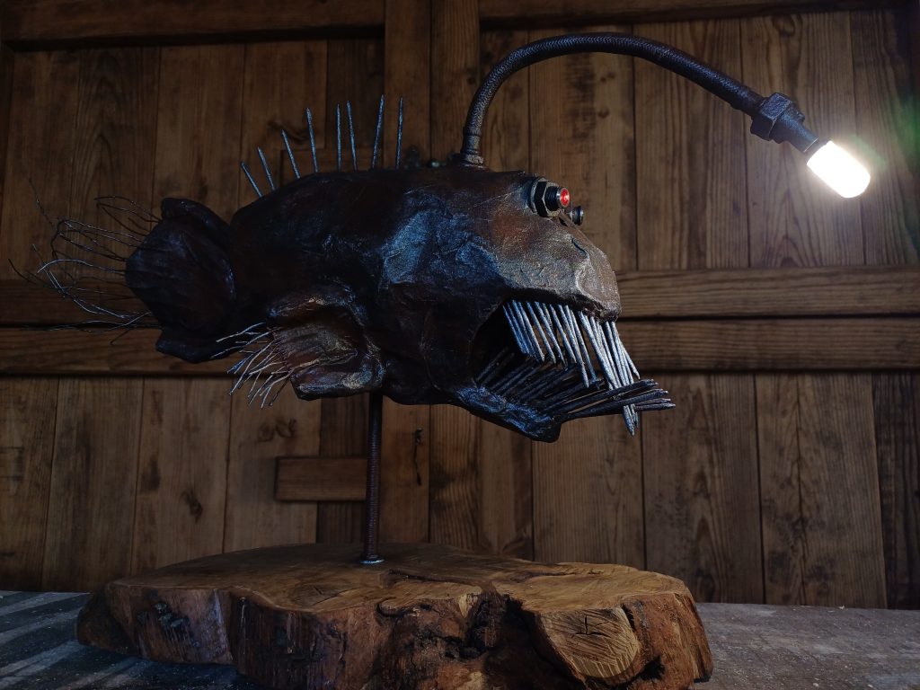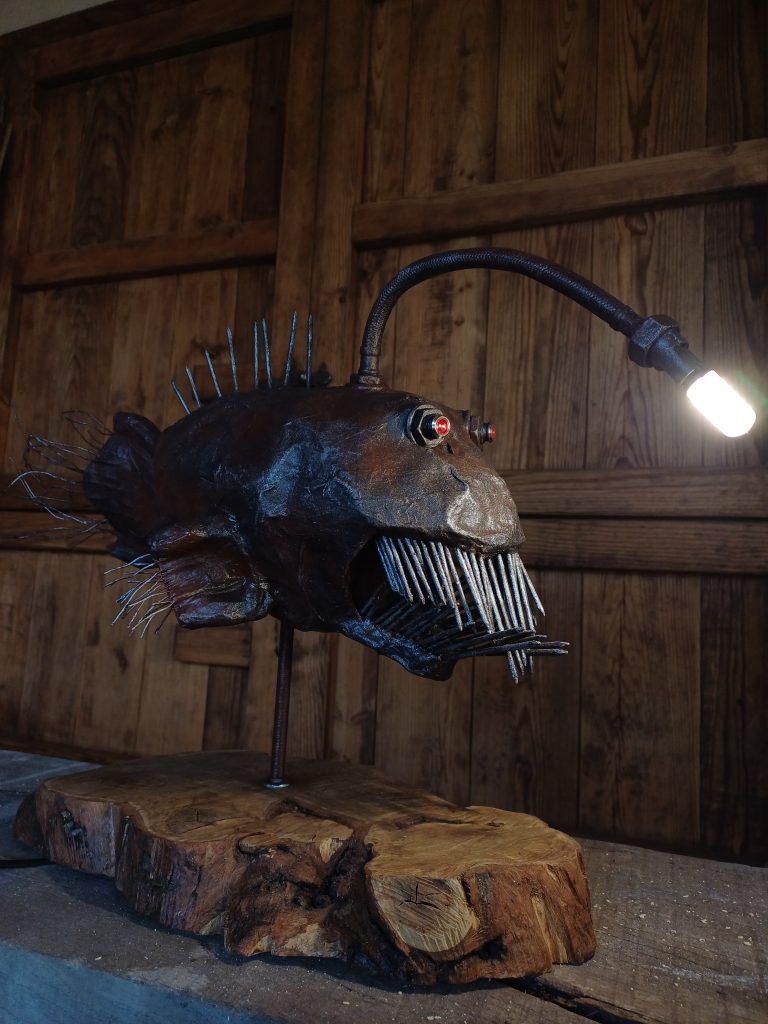 Hacer este pez linterna (pez pescador, rape de profundida,… se los conoce por varios nombres), de momento, ha sido de las ideas más laboriosas por sus infinitas capas de papel maché, ¡pero creo que el resultado no está del todo mal!